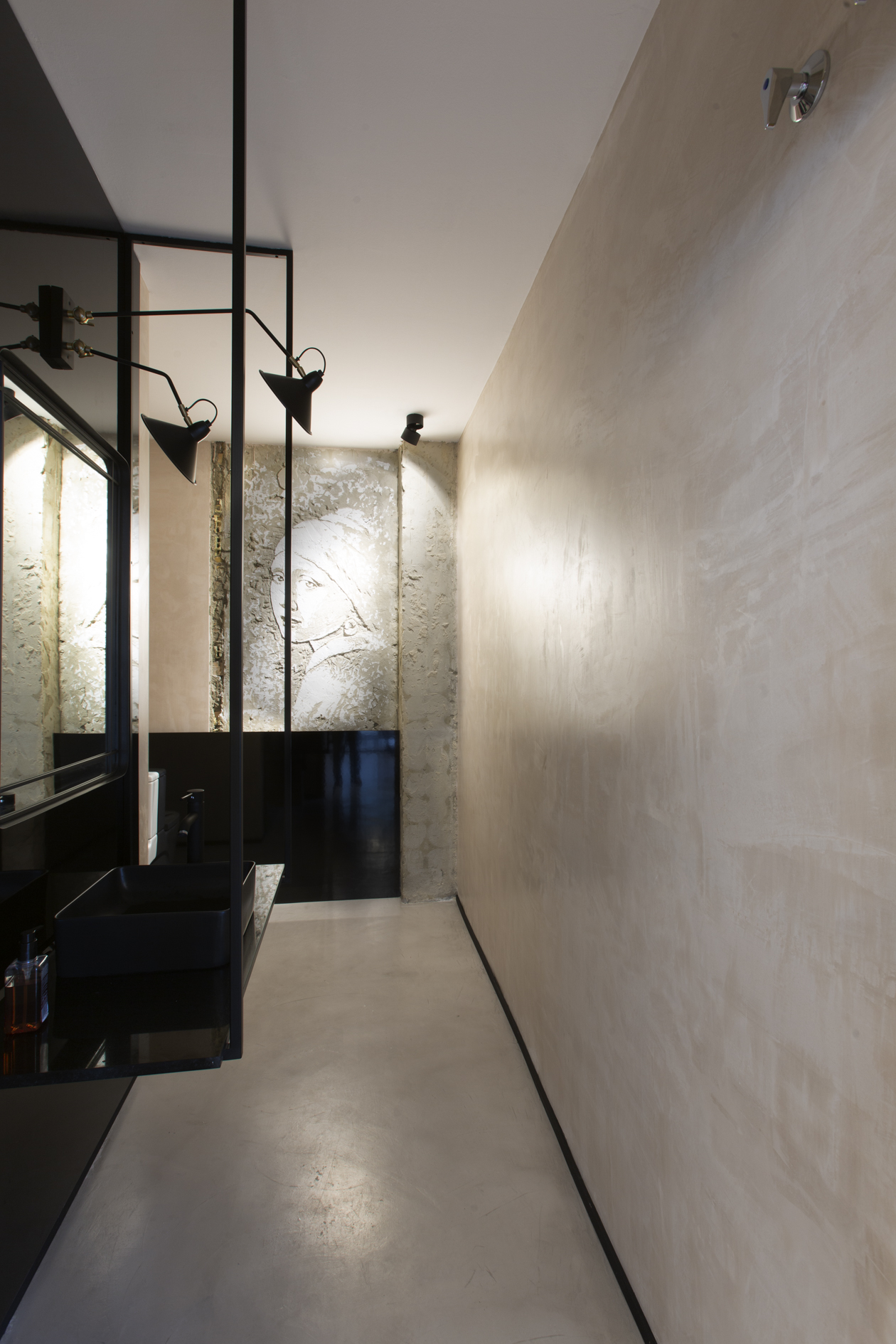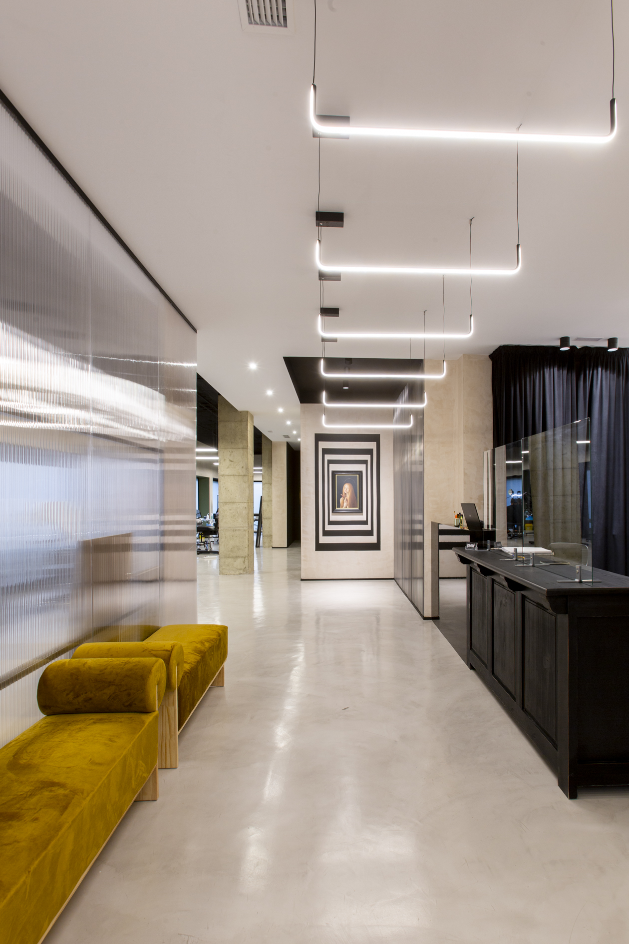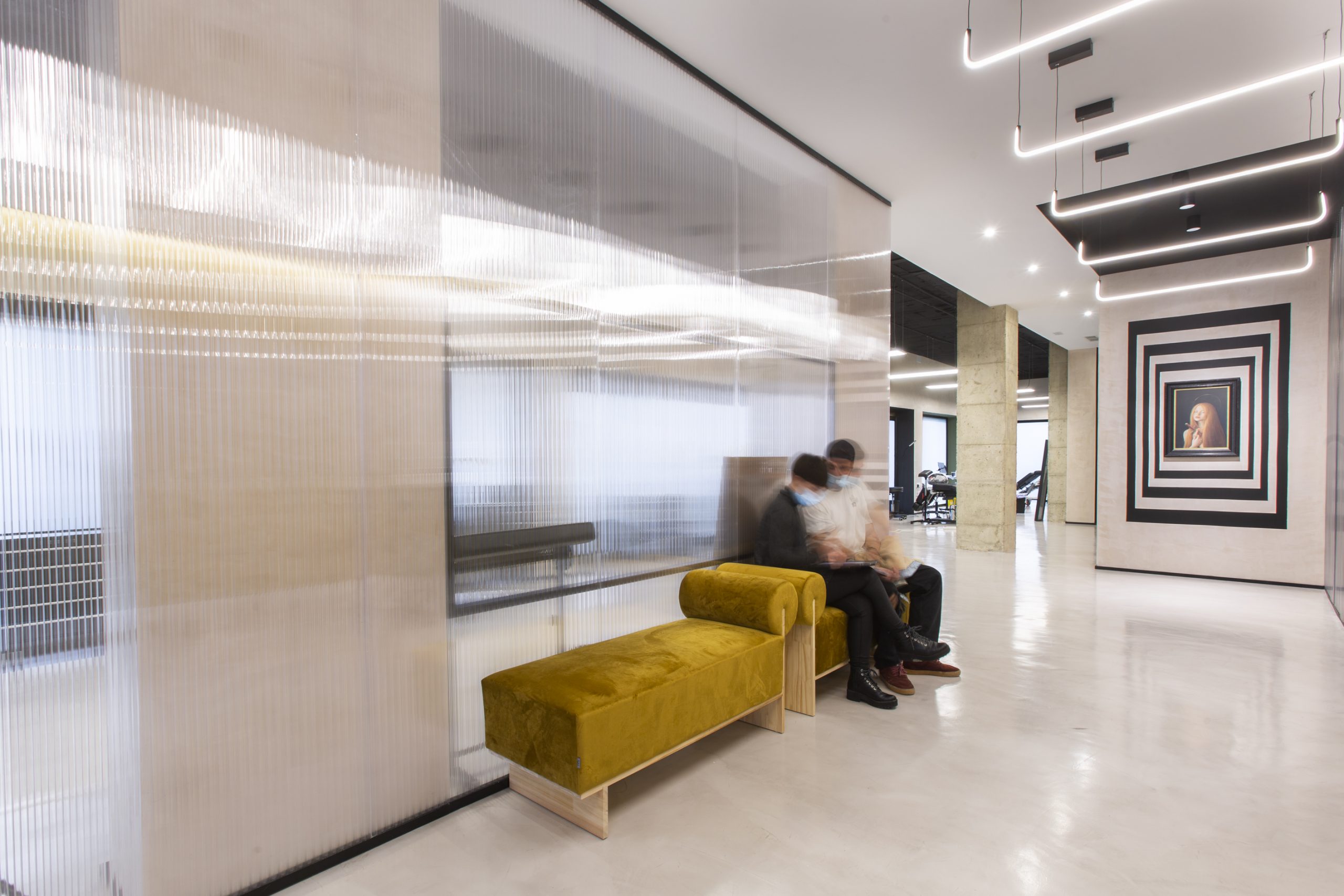 El resultado es un local radicalmente moderno dejando a la vista elementos propios de la construcción del edificio como el hormigón de los pilares y las bovedillas cerámicas del techo.